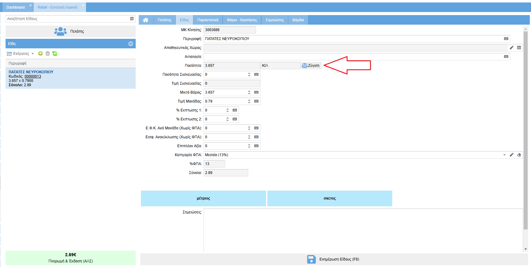 Εφόσον επιλέξετε είδος με συγκεκριμένη [Μονάδα Μέτρησης] (πχ ΚΙΛΑ), τότε στο tab [Είδος] δεξιά από το πεδίο [Ποσότητα] θα εμφανίζεται αυτόματα το button [Ζύγιση].