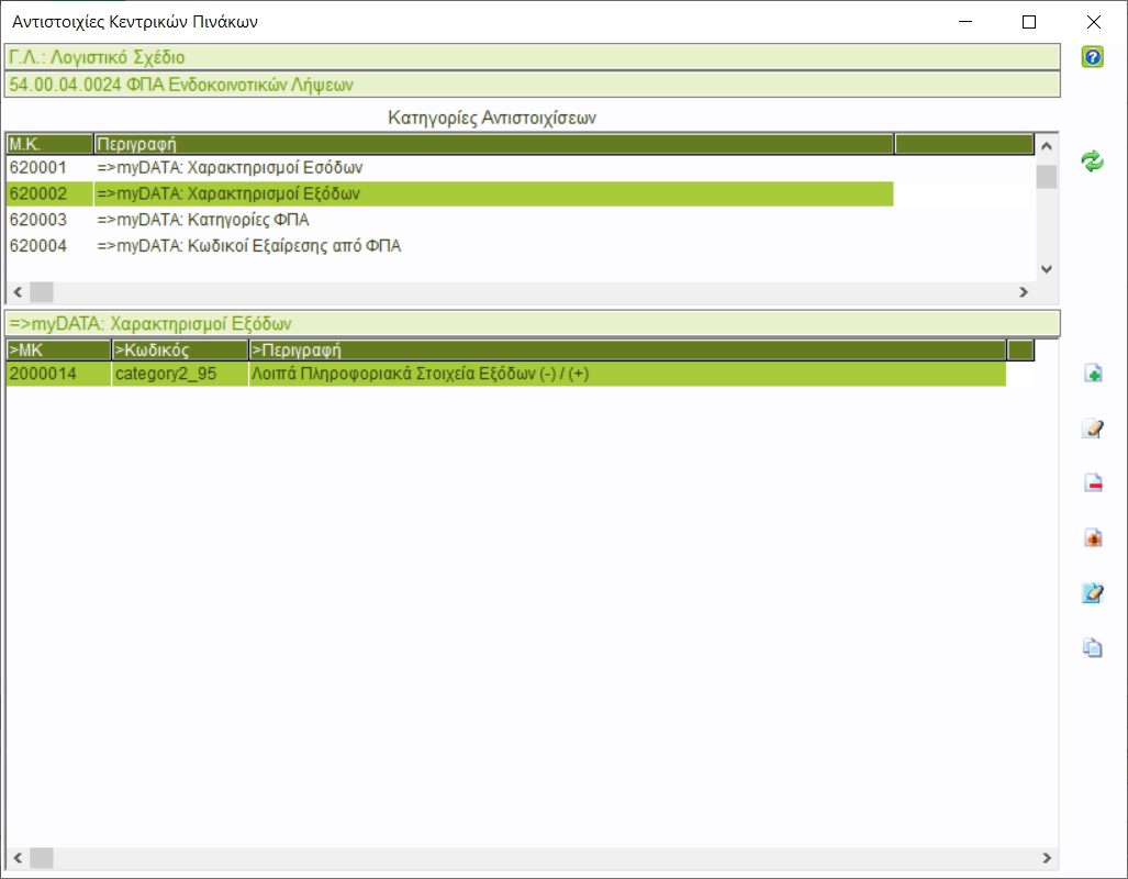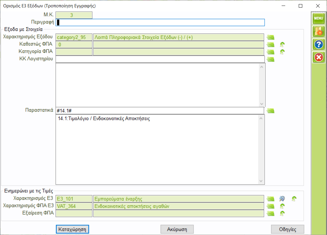 Απο την επιλογή [Toolbox-> Κεντρικοί Πίνακες Παραμετροποίησης -> Παραμετροποίηση myDATA ->Ορισμός Ε3 Εξόδων].