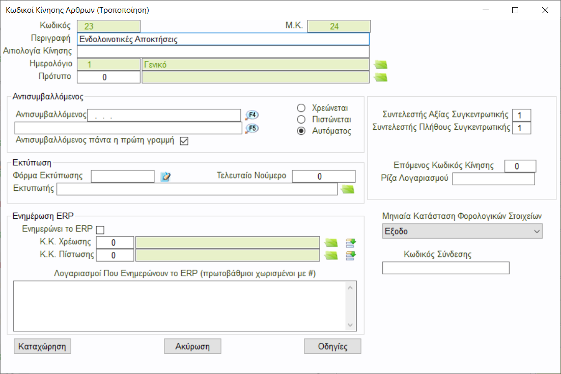 Απο την επιλογή [ToolBox-> Εργαλεία Παραμετροποίησης -> Παραμετροποίηση Εφαρμογής -> Κεντρικοί Πίνακες Παραμετροποίησης -> Γενικής Λογιστικής -> Κωδικοί Κίνησης Αρθρων ] θα δημιουργήσετε ενα νέο στο οποιο θα ορίσετε