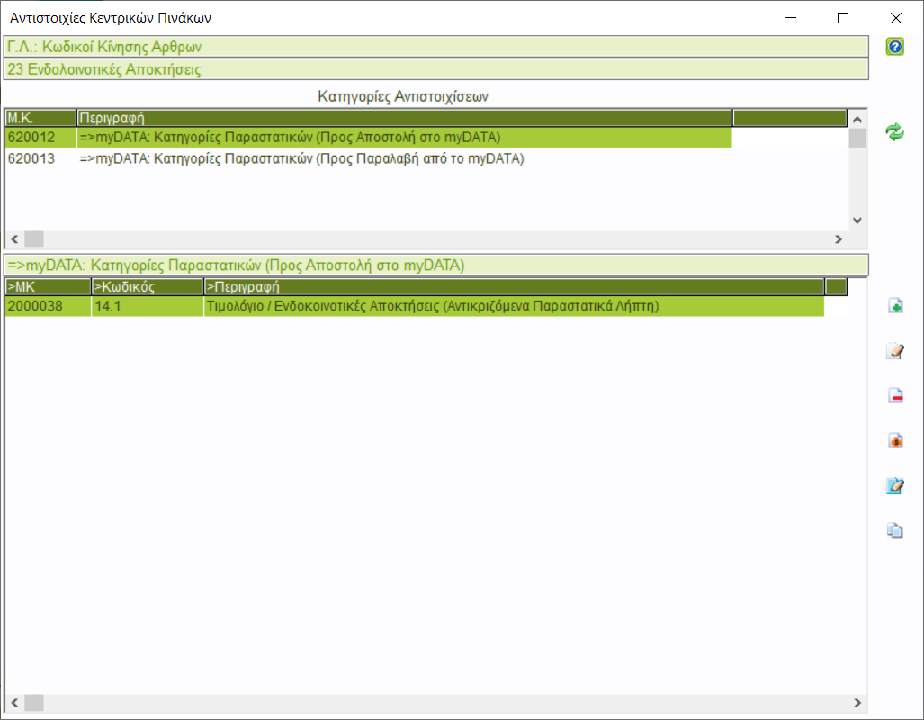 Έπειτα απο [ToolBox-> Εργαλεία Παραμετροποίησης -> Παραμετροποίηση Εφαρμογής -> Κεντρικοί Πίνακες Παραμετροποίησης -> Γενικής Λογιστικής -> Κωδικοί Κίνησης Αρθρων ] και αφου επιλέξετε το κωδικο που δημιουργήσατε παραπάνω, απο [Λοιπες Δράσεις->Αντιστοιχίες κεντρικών πινάκων] θα ορίσετε: