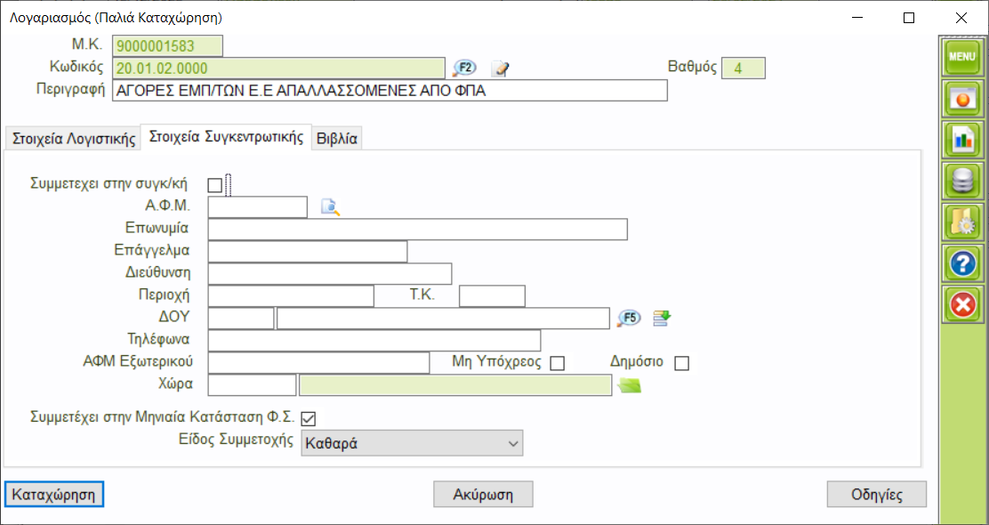 Η καταχώρηση γίνεται απο την επιλογή [Βάσεις Δεδομένων -> Γενική Λογιστική -> Αρθρα Γενικής Λογιστικής]
